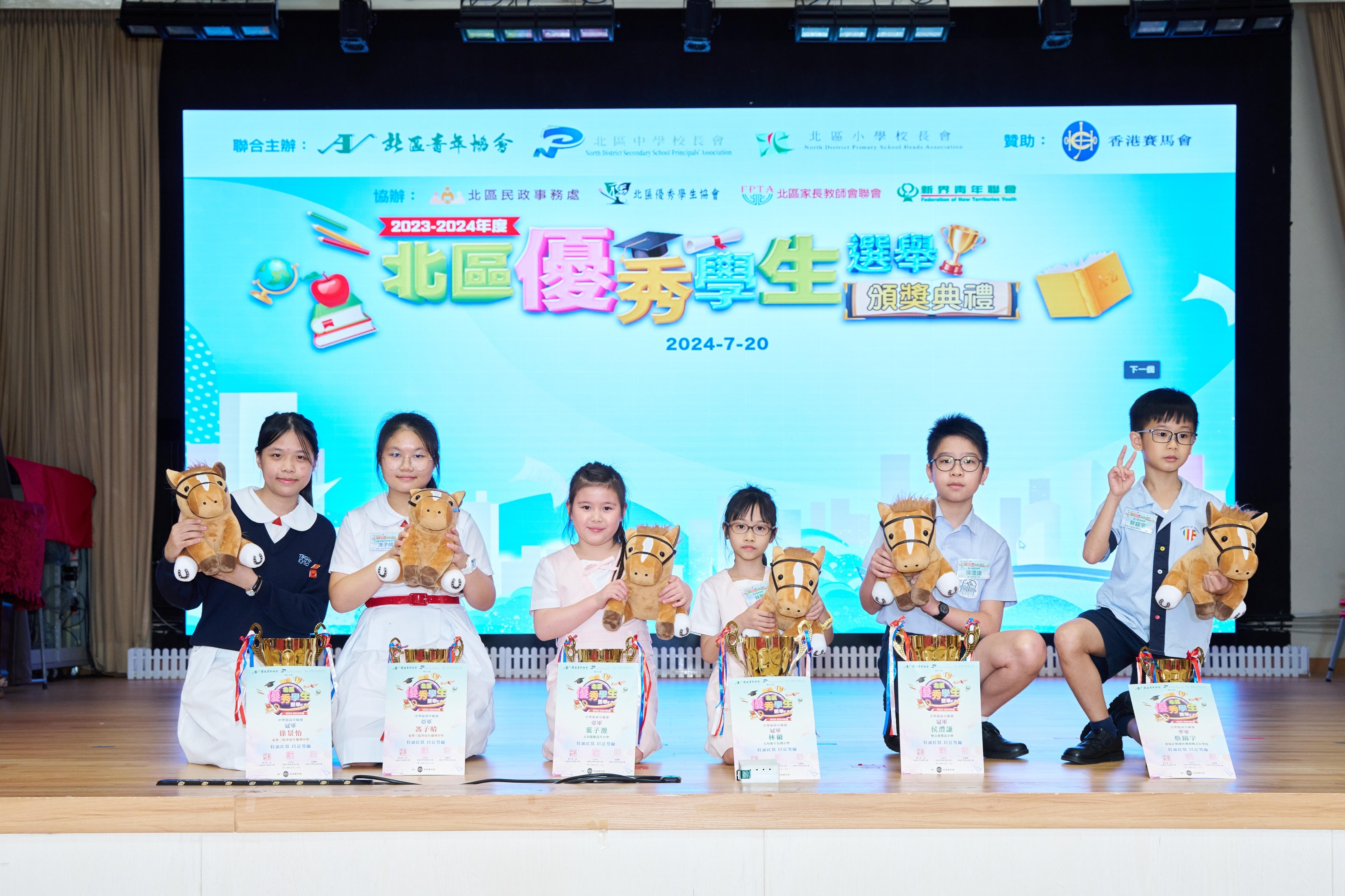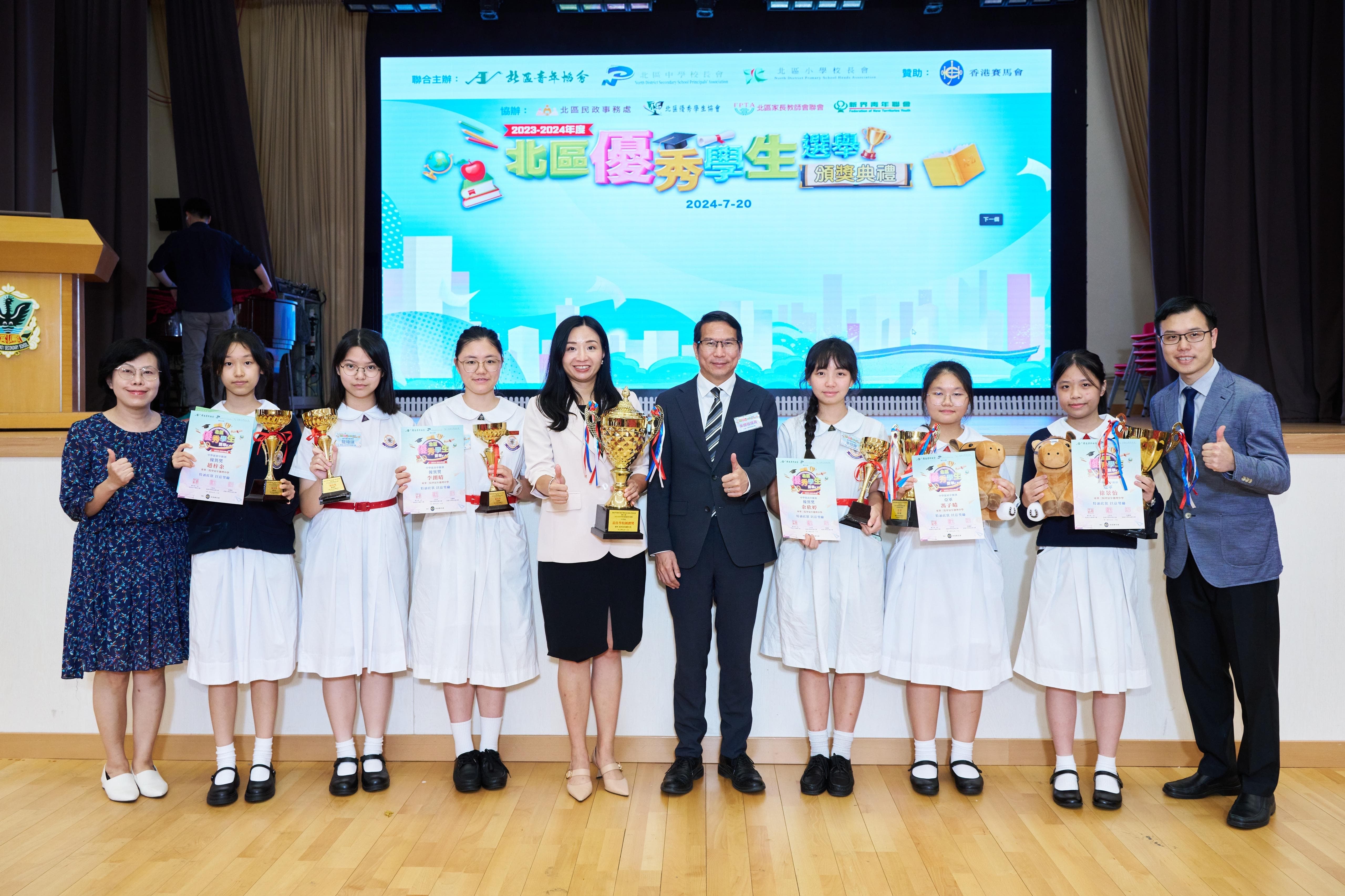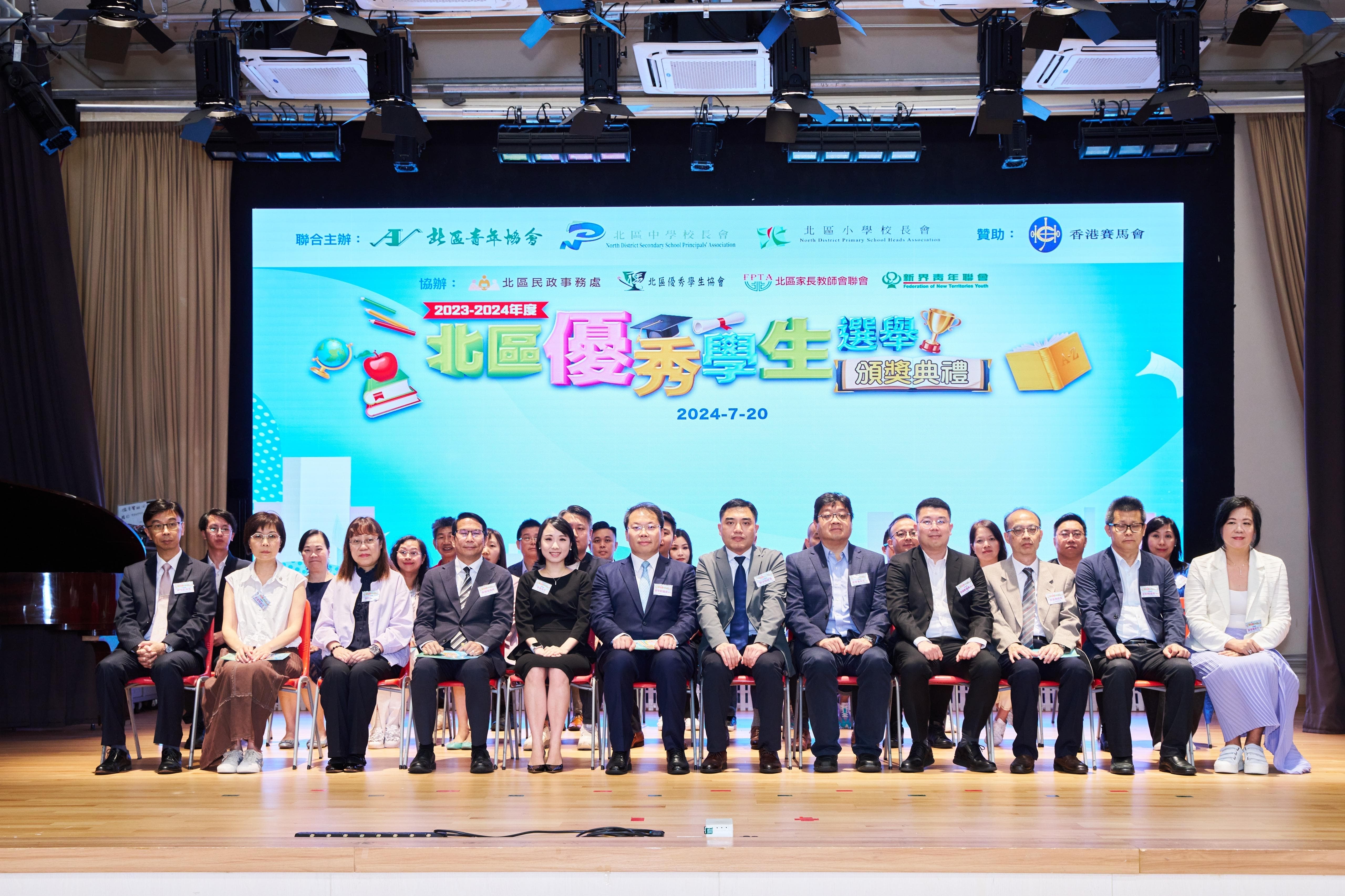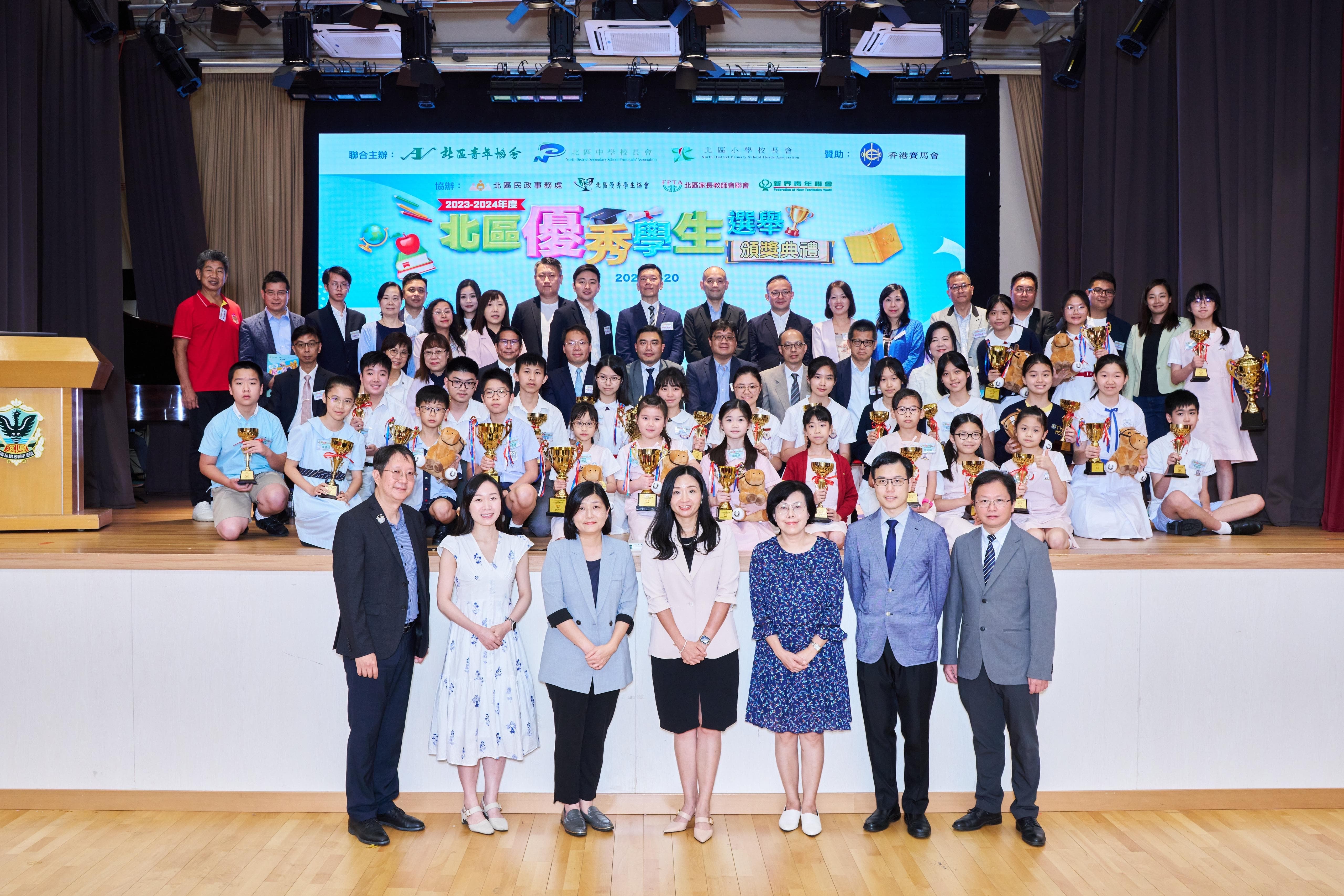 【橙訊】由北區青年協會、北區中學校長會、北區小學校長會主辦,香港賽馬會贊助的「2023-2024年度北區優秀學生選舉」頒獎典禮順利舉行,表揚了32名得獎學生的卓越成就,並邀請中聯辦新界工作部處長裴泳翔,全國政協委員、香港僑界社團聯會會長黃楚基,政務司司長政治助理李惠,立法會議員劉國勳,新界社團聯會北區地區委員會主席溫和輝,鳳溪公立學校董事局主席廖瑞彪以及青識教育發展中心執行董事張瑞蓮等擔任主禮嘉賓。