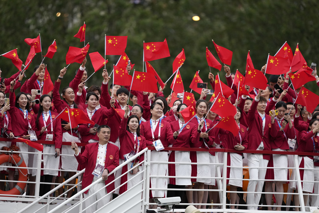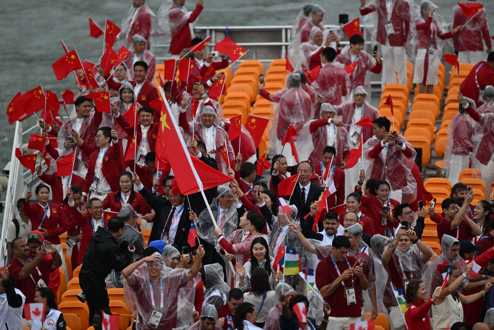 國家隊是第41隊代表隊進場,大軍紅色外套加白衫褲,非常醒神。持旗手是乒乓球的馬龍,以及韻律泳手馮宇。