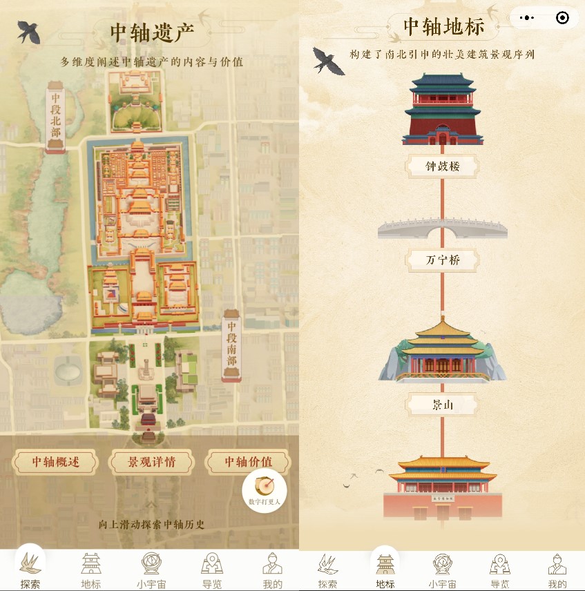 用戶可以使用智能手機,通過微信小程序「雲上中軸」打開「數字中軸.小宇宙」,在虛擬角色的導賞下身臨其境地自由探索北京地標。「數字中軸.小宇宙」以3D形式復現北京中軸線上的歷史建築,逼真的細節令人嘆為觀止。用戶還可以「穿越」歷史,遊覽目前已經損壞或現實中已不復存在的場景。