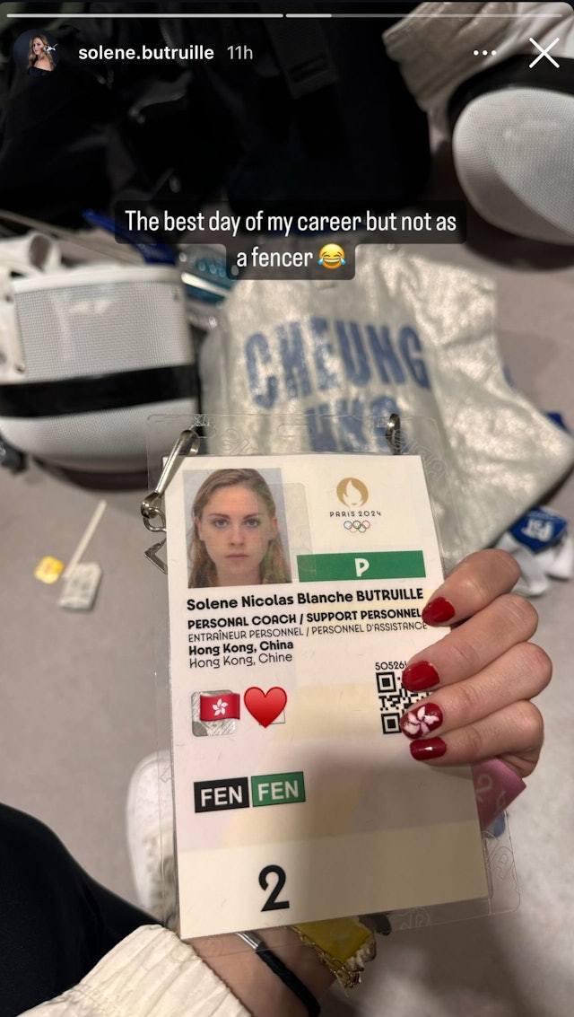 Solène日前亦高調在社交平台公開一張手持奧運工作證的照片,證上寫住她的崗位為「Personal Coach/ Support Personnel(個人教練/支援人員)」及「Hong Kong, China」,她更超有心連指甲都塗上香港區徽,而工作證後面亦擺放著一件寫住「CHEUNG HKG」的比賽服和面罩,明顯是去支持男友兼「宣示主權」。過去張家朗曾跟「微笑劍后」江旻憓傳緋聞,但早就否認,而他公開過的女友只有前港隊單車運動員「單車女神」馬詠茹,但二人拍拖3年分手。