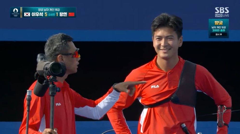 王岩在巴黎奧運射箭項目淘汰賽入面輸給韓國選手李雨錫。(圖:SBS直播截圖)