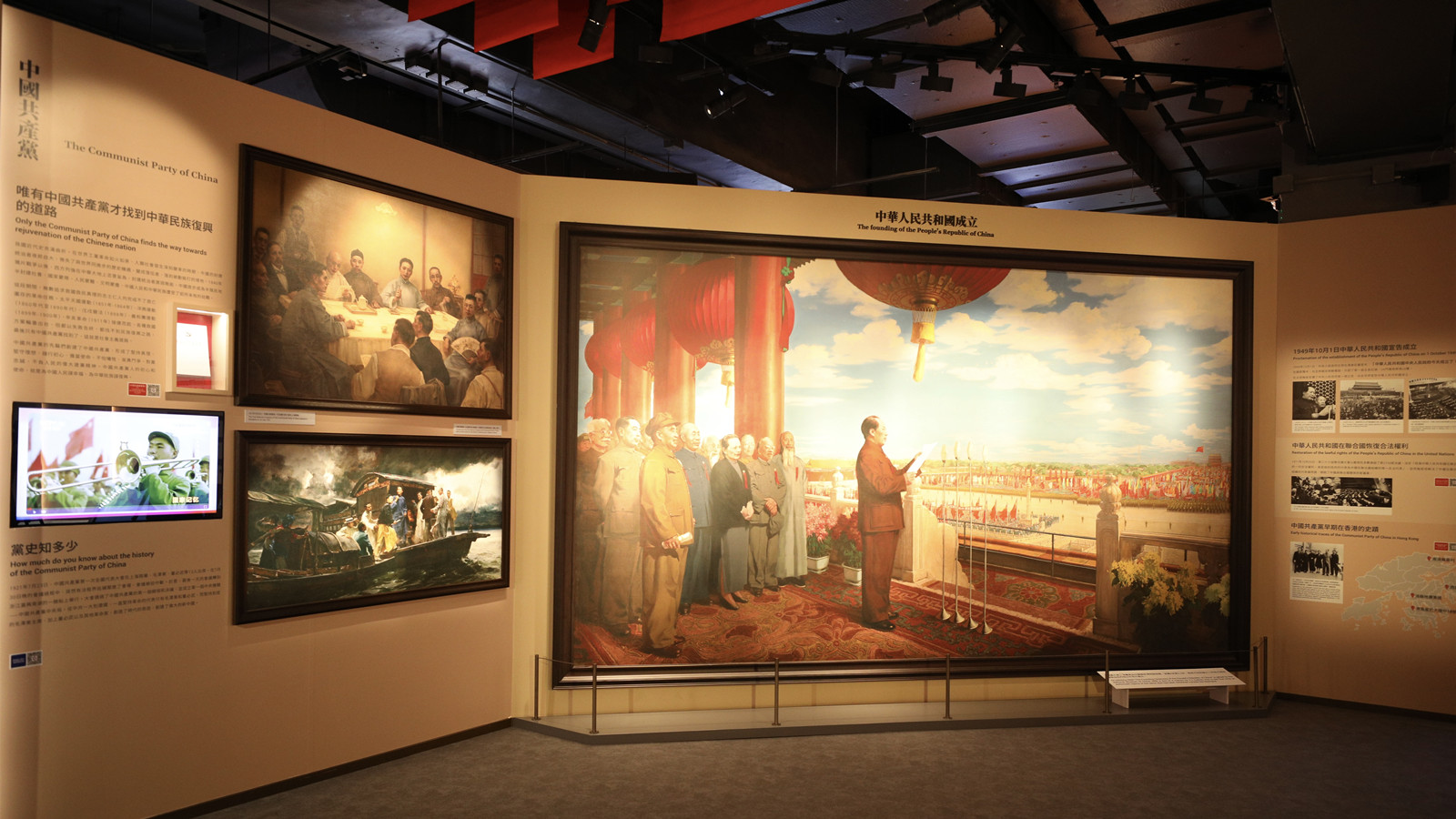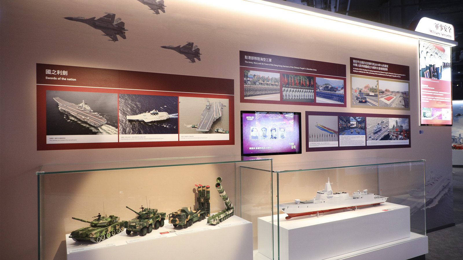 展品包括由國家航天局借出的月球土壤;由北京市政府贈送、在《香港國安法》生效當天,在天安門廣場上高掛的特大號國旗;《開國大典》油畫一比一複製品;中國空間站模型、長征5號運載火箭模型;東江縱隊的駁殼手槍;亦有多款軍備例如殲-20戰機模型、殲-15戰機模型等等。