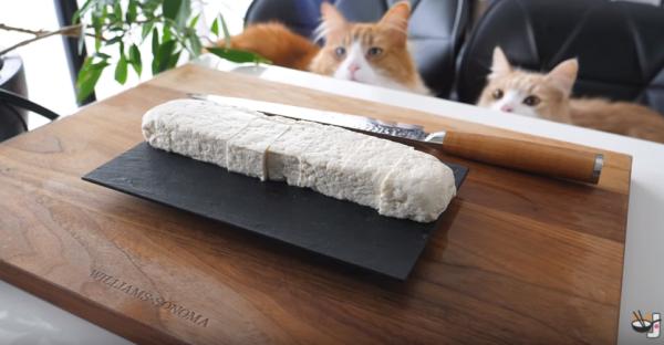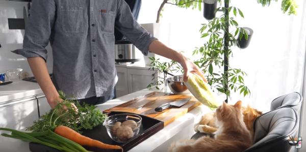 Jun的每條料理視頻都少不了他的兩隻愛貓,兩個小傢伙乖乖地坐在椅子上慵懶地看著Jun做飯,Jun時而用新鮮的食材逗逗貓,喵星人偶爾也有些福利。
