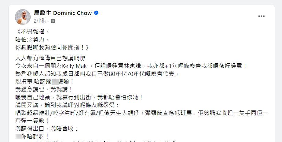 【橙訊】63歲音樂人周啟生向來言行出位,不時在社交平台公開批評樂壇後輩。日前他就在Facebook出帖文,表示歡迎網民留言選出「你最唔要聽到佢唱歌嘅歌手」,沒想到近年在各大音樂頒獎禮橫掃不少獎項的林家謙居然被點名,周啟生隨即以一句「嗰條廢青我都麻麻哋鍾意!」回應,即時遭到網民「洗版式」鬧爆。