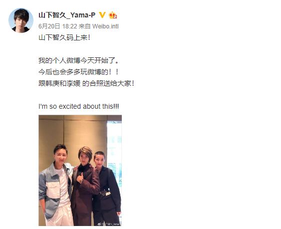 目前,山下智久的微博賬號@山下智久_Yama-P已經獲得微博認證,而昨晚他更發出第一條微博,並放出他與新作電影搭檔韓庚與李媛的合影。