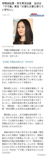 日本女演員仲間由紀惠通過事務所公佈,她已於6月底誕下一對雙胞胎兒子。