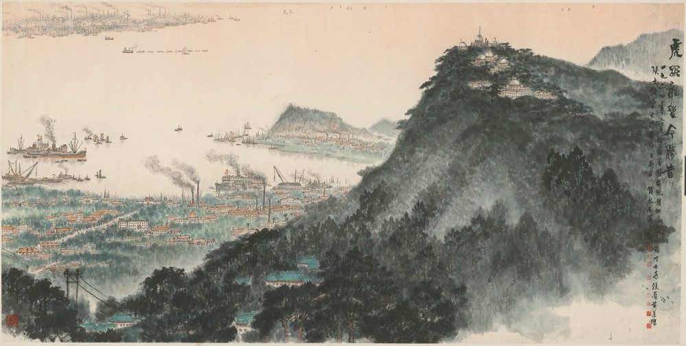 錢松嵒、余彤甫、丁士青、張晉、黃養輝、張文俊、宋文治合作,傅抱石題 《虎踞龍盤今勝昔》