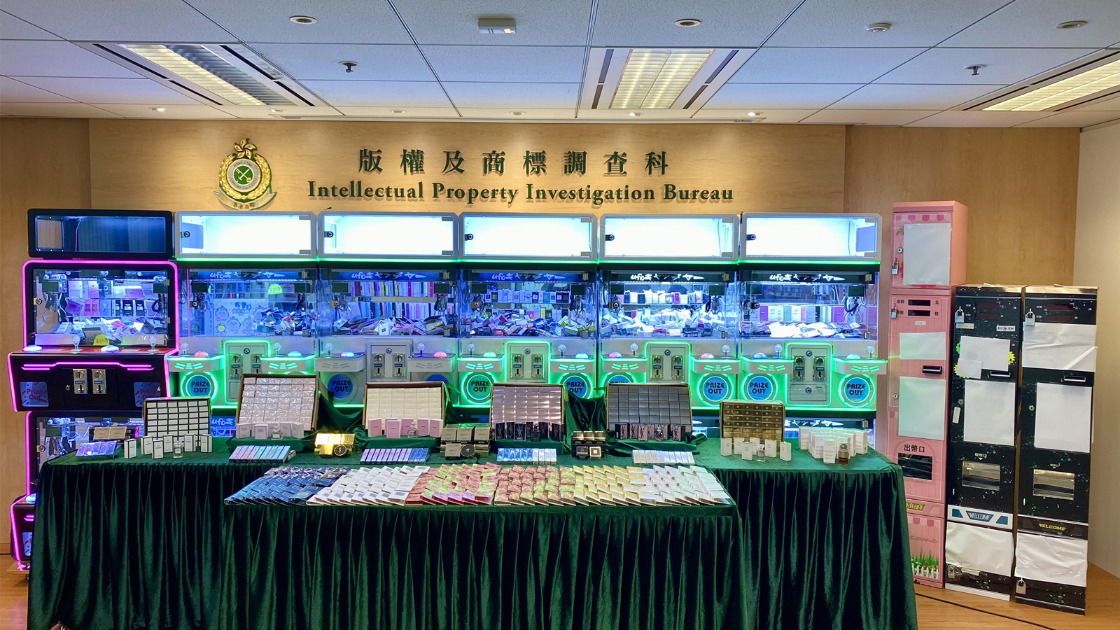 海關展示檢獲的證物包括6部夾公仔機。