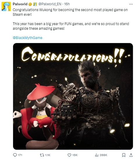 《幻獸帕魯》官號在X平台恭喜《黑神話:悟空》在線玩家數衝上第二名。
