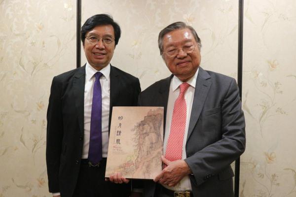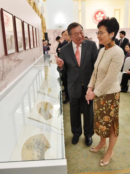 行政長官林鄭月娥早前出席至樂樓藏中國書畫捐贈儀式,圖示林鄭月娥(右)與至樂樓藝術發揚(非牟利)有限公司主席何世柱(左)欣賞收藏品