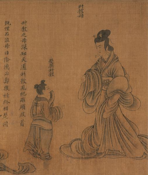 此圖為《列女圖卷》的一部分,表現的正是叔敖之母稱讚並寬慰孫叔敖的情節