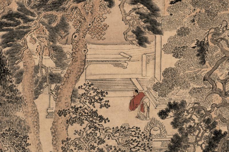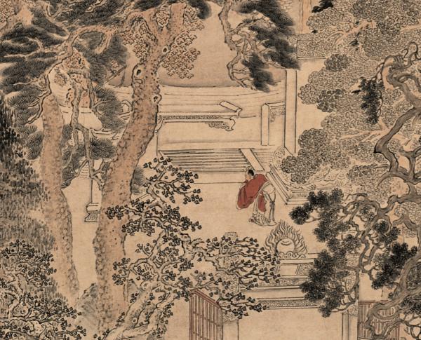 此圖為明代吳門畫家張宏所繪,徐君墓隱於松柏之後,季札躬身而拜,寶劍掛於樹枝之上
