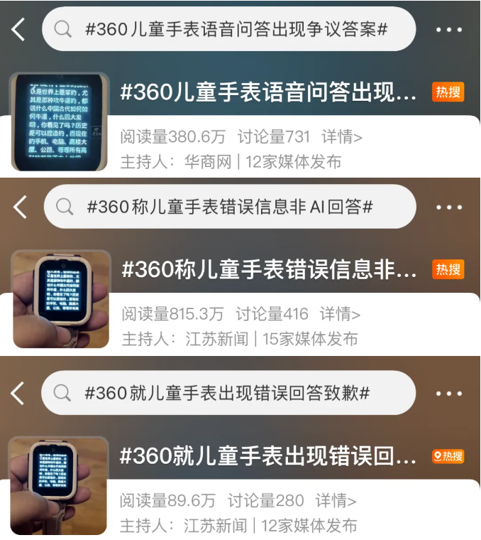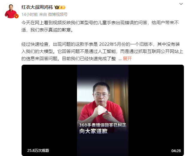 周鴻禕表示,經迅速核查,問題手錶為2022年5月發布的舊版,未集成公司大模型。其問題解答依賴於抓取網絡公開信息而非AI技術。公司已迅速整改,移除有害內容,並正升級軟件至人工智能版本。