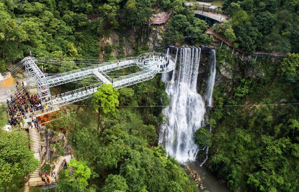想要更刺激的朋友,更可體驗橋中央位置的笨豬跳,站在橋上腳下400米處全景盡收眼底。若是想靜靜欣賞「小九寨溝」景色,大家落山後可乘搭觀光電梯,沿著谷底曲流步行於棧道,邊走邊欣賞瀑布及湖水,也是另類享受。