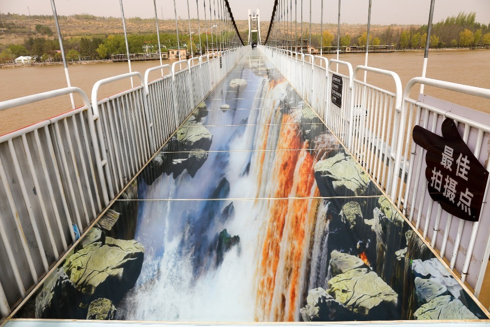 位於寧夏的黃河3D玻璃橋橫跨黃河濤濤江水,全長300多米,鋪蓋玻璃橋面約210米,橋面距離河面垂直高度約10公尺。