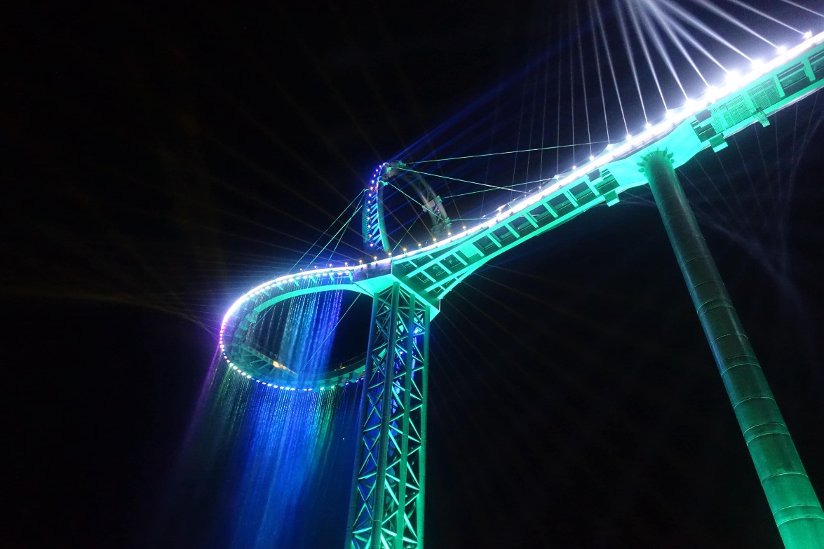 天門懸廊的另一大特色便是入夜後的音樂瀑布燈光騷,近170米「飛流直下三千尺」的環形震撼水瀑布,再配合閃爍耀眼的夜燈,使景區頓時變成一個奇幻世界,夢幻又刺激,不說還以為去了主題樂園!