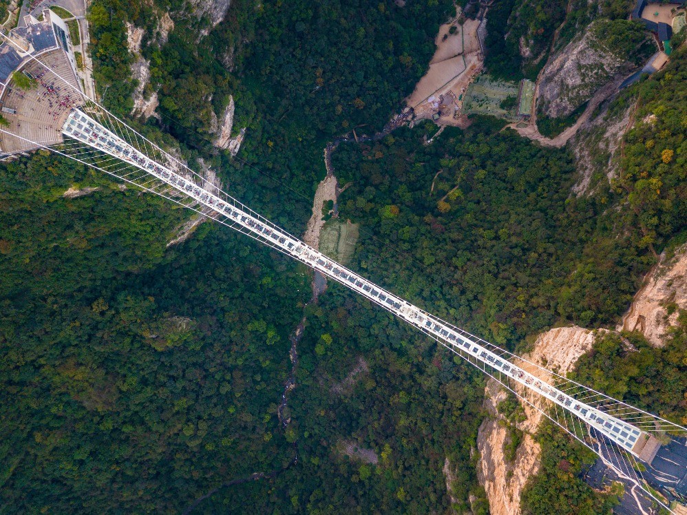橋面採用全透明玻璃鋪設,大家漫步在玻璃橋上,猶如橫跨於山峰之間,腳底是水色湛藍透徹如九寨溝的美景,亦是萬丈深淵的山谷。大家聚精會神於腳尖時,可感受那一份刺激和震撼!