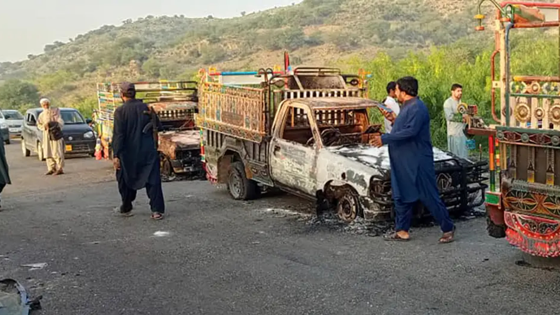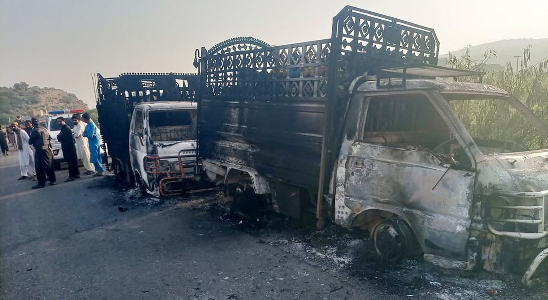 俾路支省恐襲現場,可見多輛車輛被摧毀。