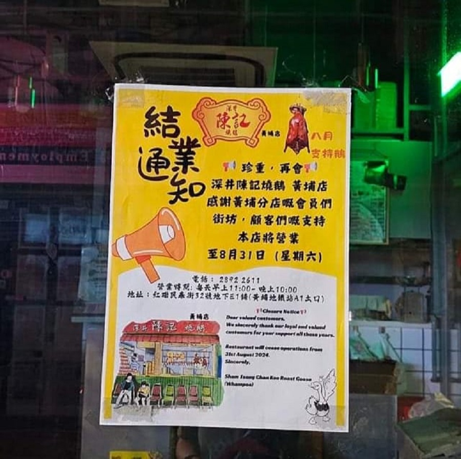 深井陳記燒鵝一直以燒鵝馳名,早已衝出深井在全港各區開設分店,其中位於黃埔的深井陳記燒鵝分店近日張貼「結業通知」,以「珍重,再會」的告別語開首,通知黃埔分店將於本周六結束營業。