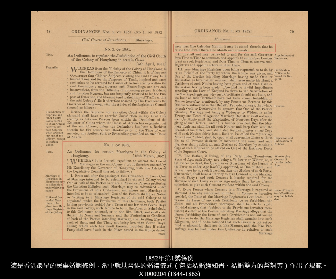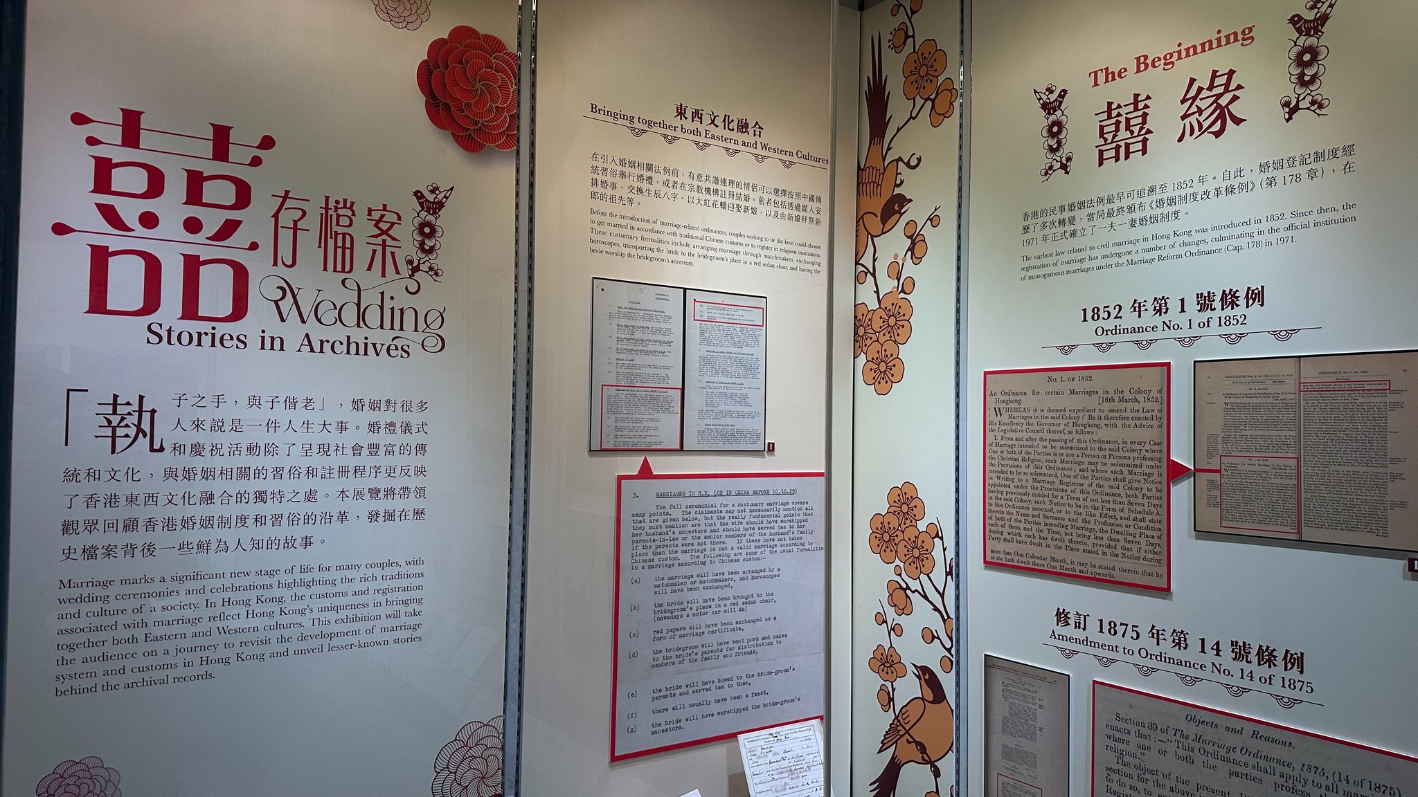 香港是個中西文化深度融合的地方,與婚姻相關的習俗和註冊程序更反映了這一文化特點。「囍存檔案」展覽設置了「囍緣」、「締結良緣」、「『囍』慶時刻」幾個專題展區,從法例、婚俗、婚姻註冊角度切入婚姻主題。