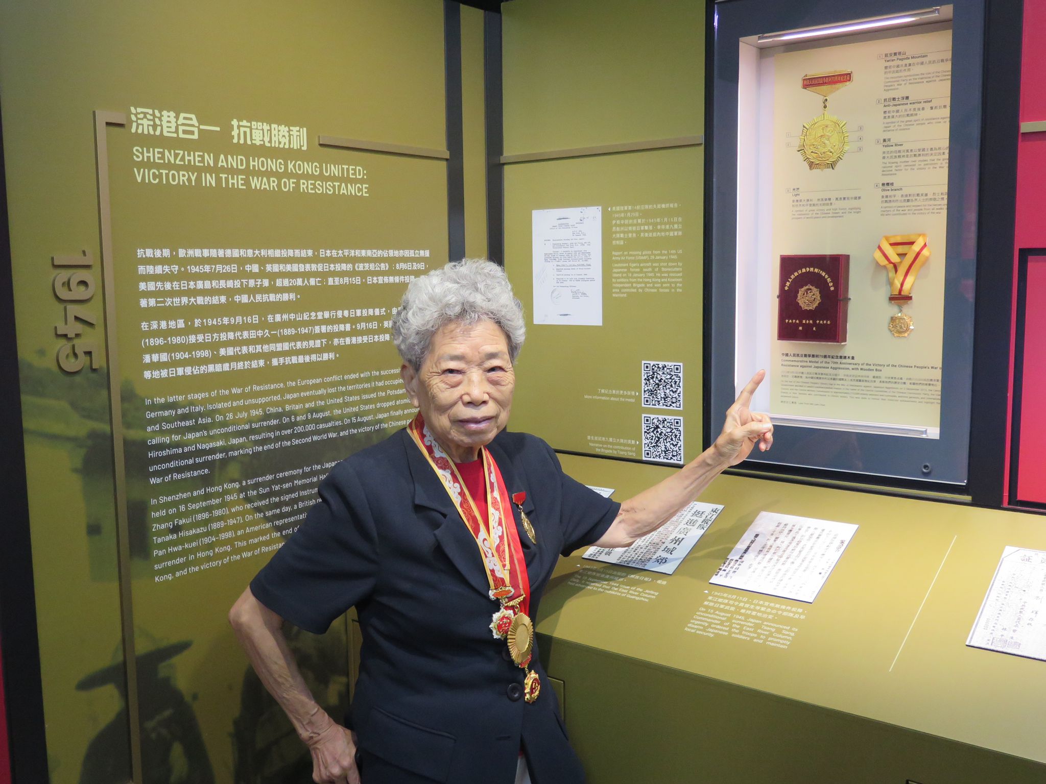 原東江縱隊港九獨立大隊老游擊戰士聯誼會會長林珍展示中國人民抗日戰爭勝利70周年紀念章。 圖:橙新聞