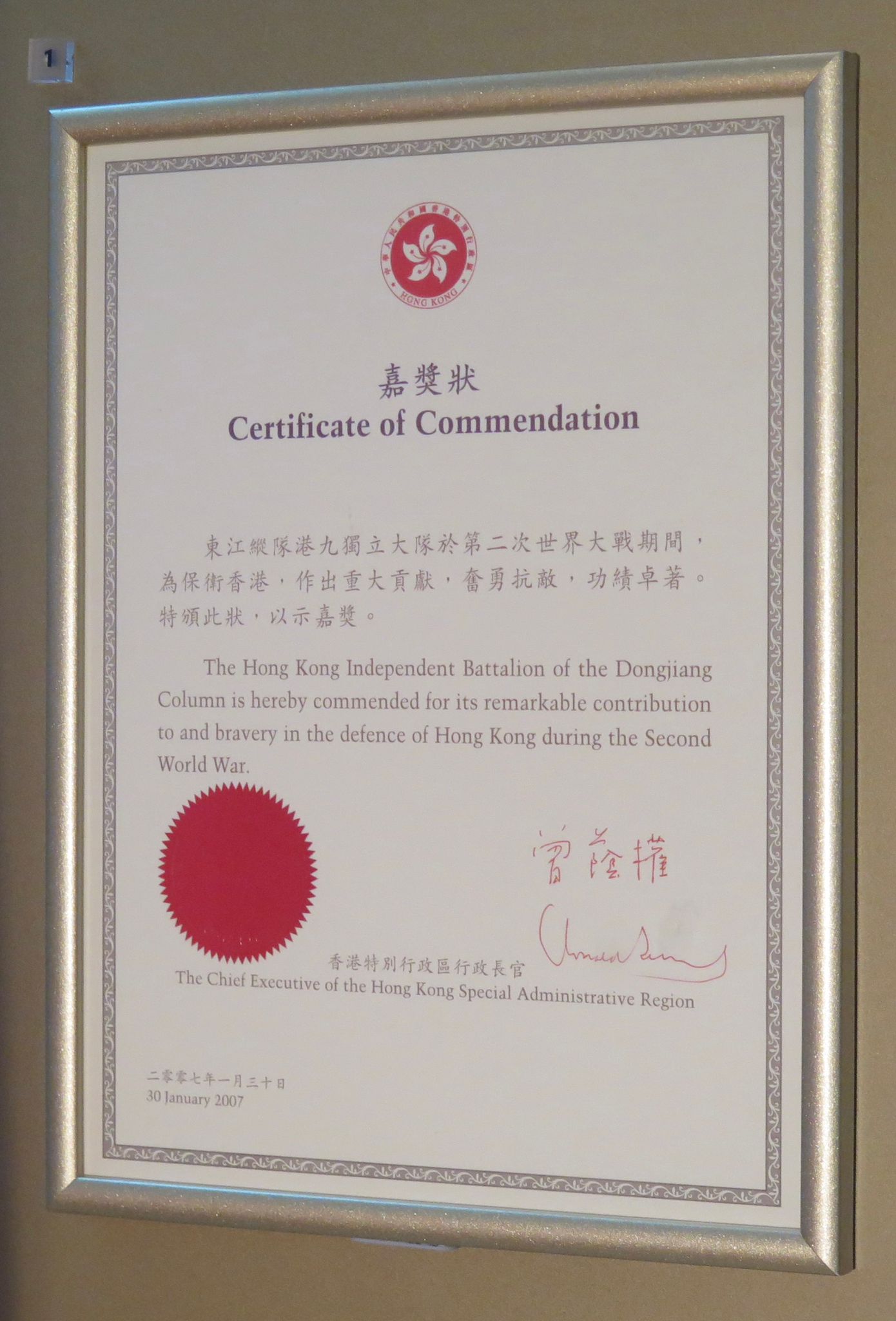 特區政府授予的嘉獎狀。 圖:橙新聞