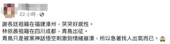 林依晨遭受攻擊後,有台灣網友翻出現任賴清德辦公室「資政」謝長廷十多年前回祖籍地福建漳州市東山縣祭祖的報道。畫面中,謝長廷持香拜謁,激動落淚,認祖歸宗的感情溢於言表。那趟尋根之旅中,謝還表示,沒有祖宗就沒有他。
