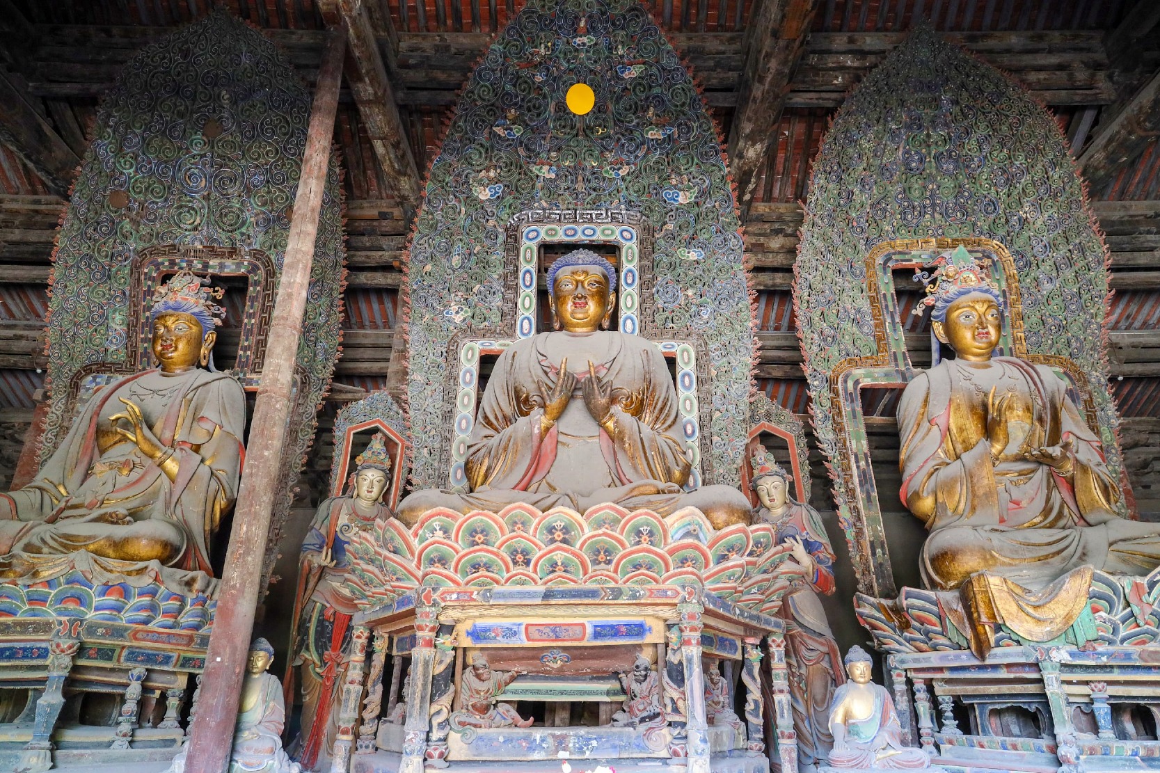 在崇福寺彌陀殿内,供奉着阿彌陀佛、觀世音和大勢至二菩薩,均於金代建成。3座塑像雕刻精緻,神態端莊,為金代佛像雕塑中的上乘之作。(圖片來源:視覺中國)