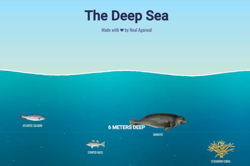 今年21歲的創意程式設計愛好者Neal Agarwal自幼便熱愛設計網頁,「深海」網頁穿透海平面,透視海底10,000多米的海洋動物分佈區,大家只需要不斷向下滾動頁面,便可以看到海底生物會出沒在何種深度的海水中。