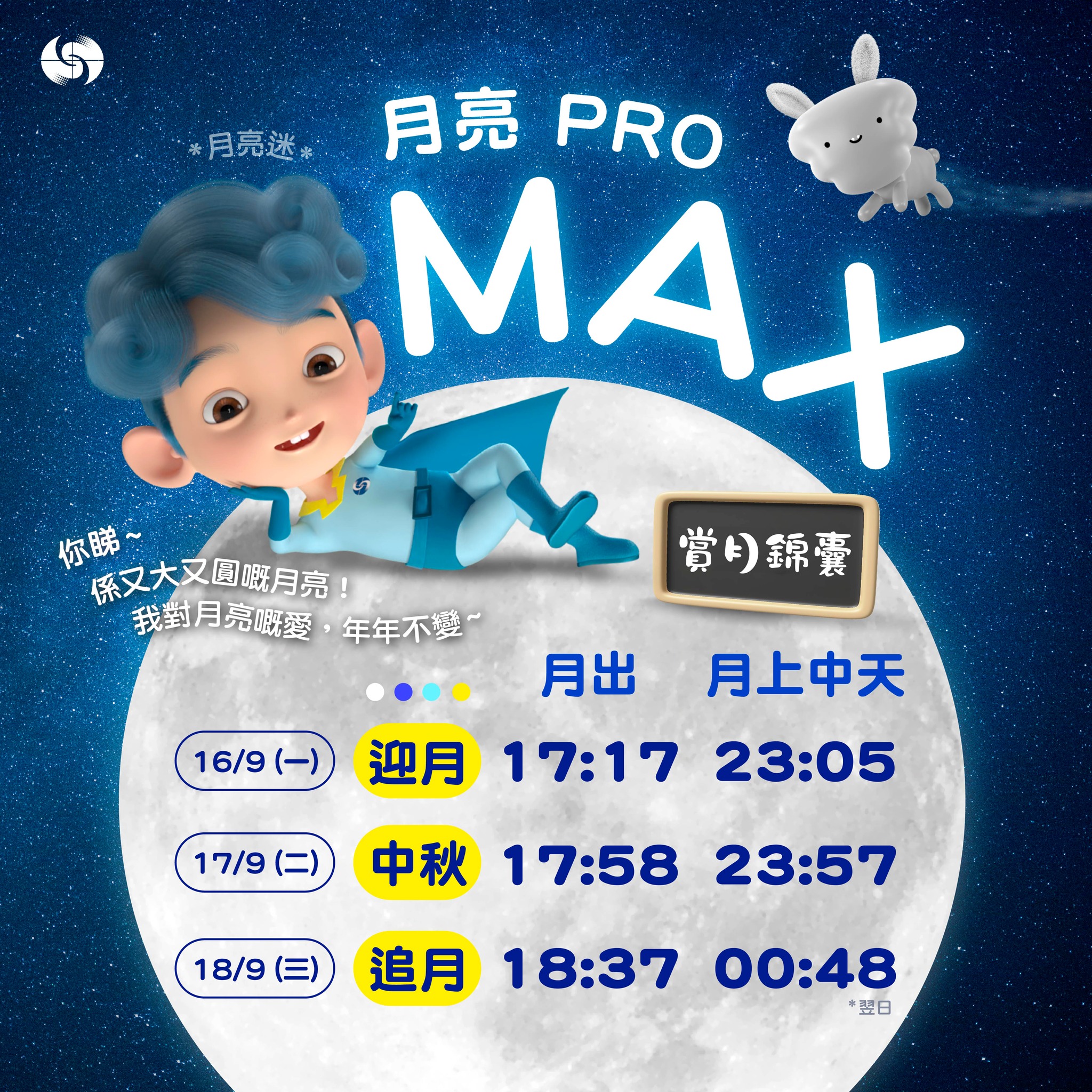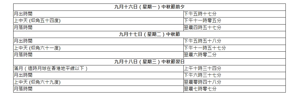 為方便市民賞月,附上賞月錦囊,表列出中秋節前後(16至18日)月出、月上中天、月落及滿月的時間。「上中天」是月球橫越本地子午線的時刻,這時月球位於正南方,仰角為全晚最高。
