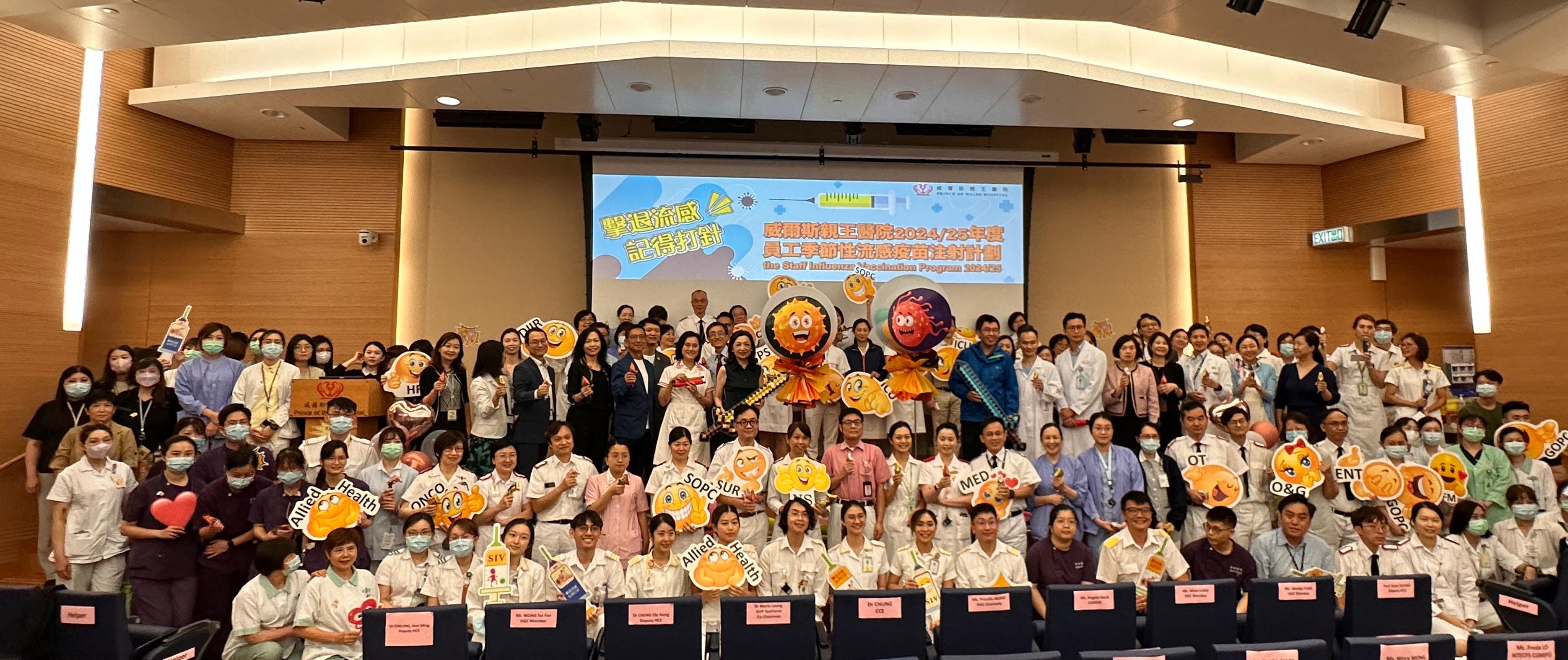 鍾健禮醫生(前排左六)聯同威院管治委員會主席王沛詩女士(前排左五),及一眾威院員工參與「員工季節性流感疫苗注射計劃」啟動禮。