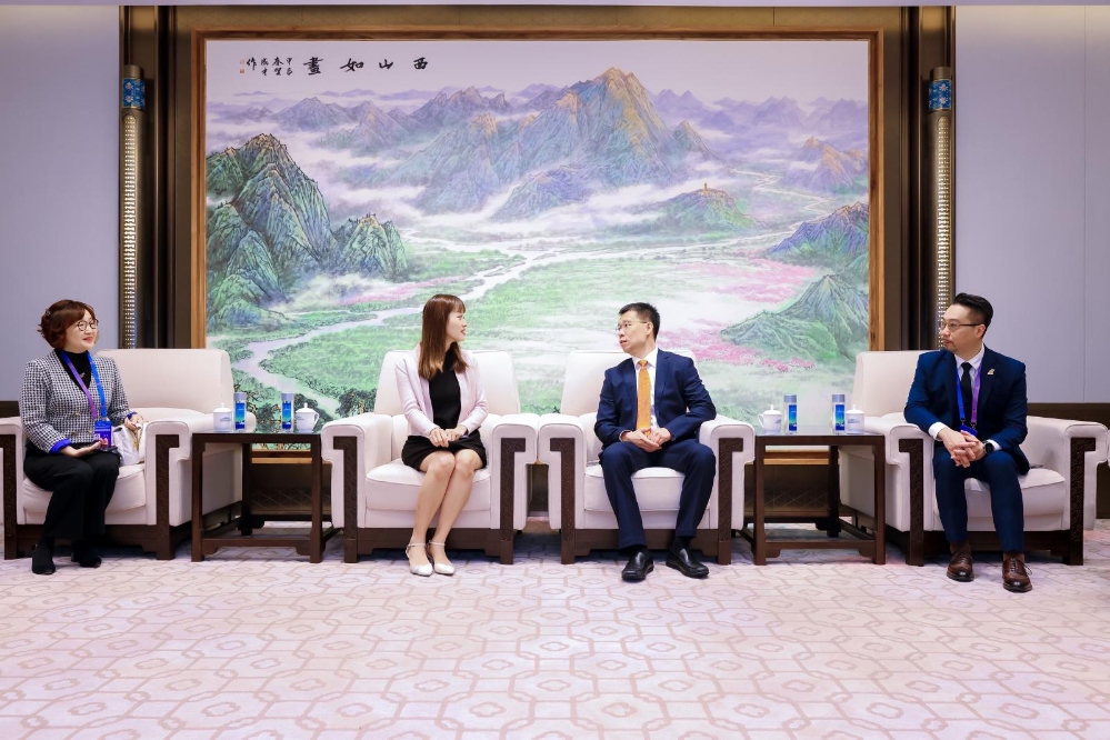 張曼莉(左2)出席京港數字經濟創新發展專題活動前,與北京市經濟和信息化局黨組成員、副局長蘇國斌(右2)會面。