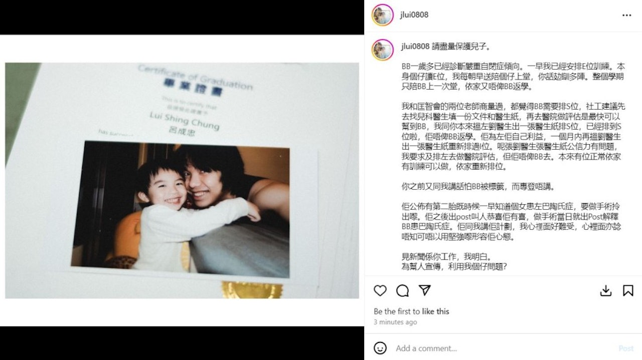 到日前莊韻澄在出席活動時透露仔仔患有自閉症障礙,但就表示會樂觀面對,直言「從不覺得照顧孩子是辛苦的」,怎料新聞一出再引來呂成忠爆料指仔仔早在一歲多時已被診斷有嚴重自閉症傾向,更踢爆「我每朝早送個仔堂,你話攰瞓多陣,整個學期只陪BB上一次堂,而家又唔俾BB返學。」又指莊韻澄因「自身利益」而不肯讓BB接受訓練。