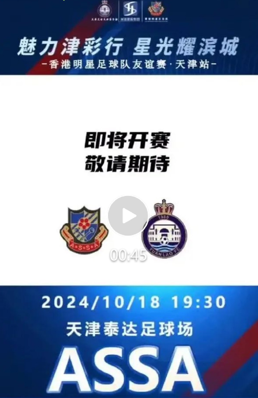 香港明星足球隊天津友誼賽將於10月18日晚上19:30舉行。
