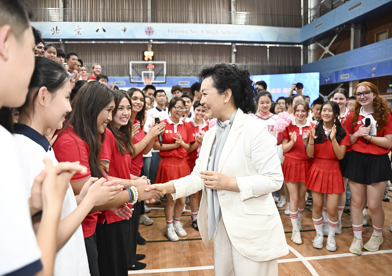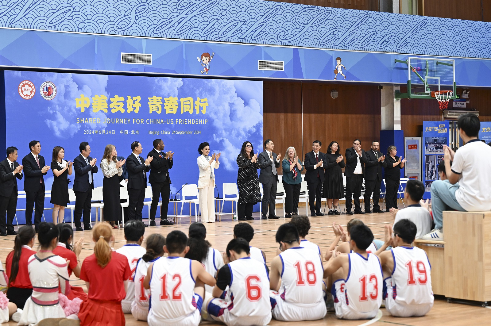 彭麗媛同中外嘉賓一道觀看了中美青少年籃球友誼賽,並為雙方隊員頒發紀念獎牌。兩國學生啦啦隊表演了充滿活力的健身操,贏得現場陣陣掌聲。