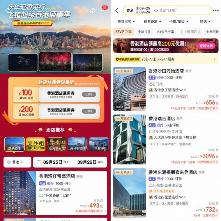 飛豬與旅發局將於今晚(25日)舉行「飛豬超級香港盛事季」的首場直播活動,並在直播間推出多重可疊加使用的優惠,折上折最高可達600元;特惠產品五星級酒店低至五折;免費送境內往返香港及香港往返境外千張機票。