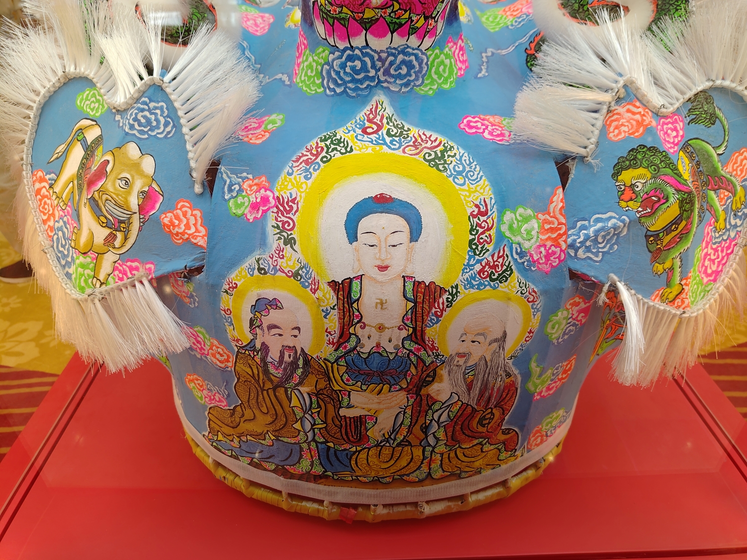 紮作學徒伍彥維師承夏中建師傅,他設計的三教獅頭,結合儒教、釋教、道教三個對中華文化影響頗深的宗教,以藍色為背景,畫有孔子、老子、釋迦牟尼等三教代表人物,過海八仙之道具,佛教儀式常用器物等。