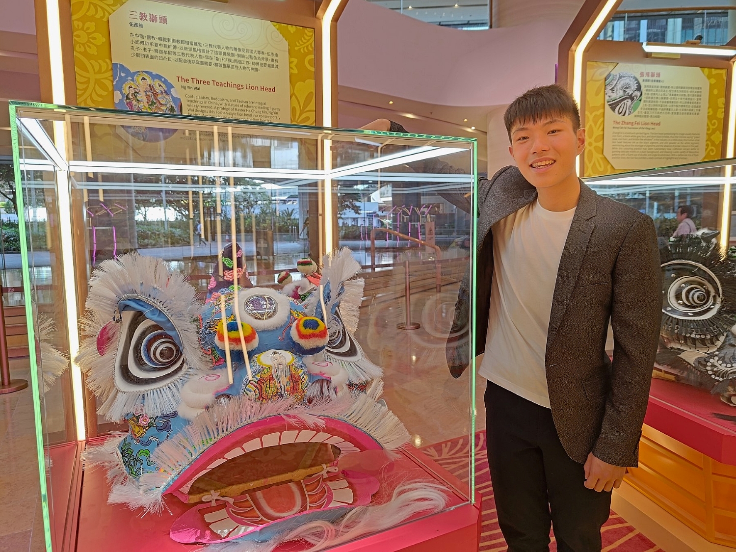 除獅頭和紮作步驟展示外,展覽位還設置了含有獅頭元素的電子背幕,觀眾可選擇在預設的電子背幕前擺姿勢打卡。背幕有三款設計,適合個人或一家大小拍攝。拍照完畢,掃描二維碼,即可下載照片到手機內。
