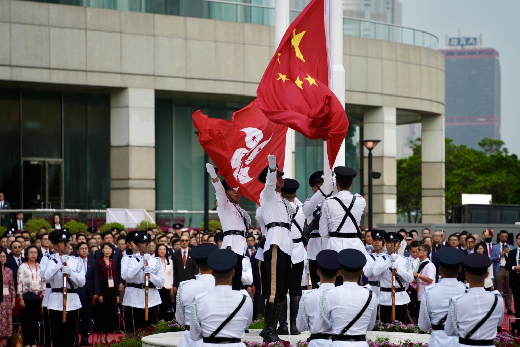 警察樂隊在升旗儀式中奏樂,在歌唱家領唱下,庇理羅士女子中學和皇仁書院合唱團獻唱國歌;紀律部隊在空中和海上敬禮。