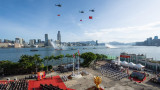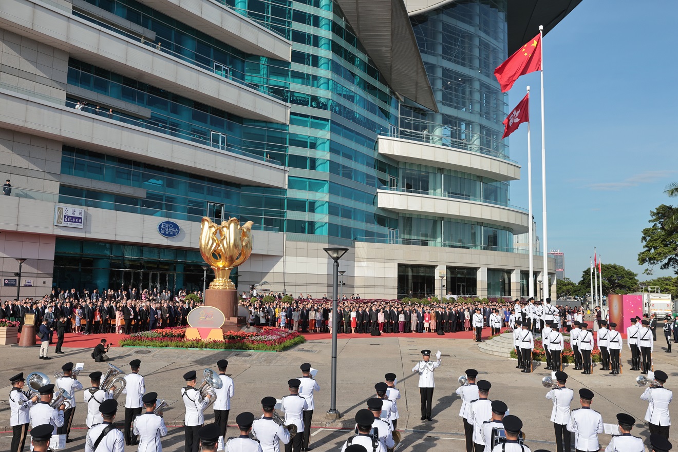 香港特區政府早上8時舉行升旗典禮,在香港警察銀樂隊的奏樂中,護旗方隊進入金紫荊廣場。隨著樂隊奏響國歌,鮮豔的中華人民共和國國旗和香港特別行政區區旗冉冉升起。懸掛著國旗和區旗的特區政府飛行服務隊直升機飛過維多利亞港上空,消防處滅火輪噴灑水花駛過水面。