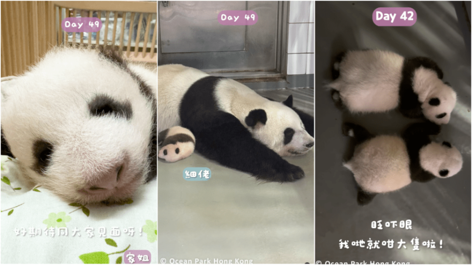【橙訊】海洋公園大熊貓盈盈上月誕下龍鳳胎,大孖及細孖今日( 5日 )已50日,海洋公園亦發布新短片,記錄牠們50天的暴風成長片段。在影片中,先播放盈盈誕下龍鳳胎的情況,只見「家姐」和「細佬」來到世界是全身光滑無毛,之後「家姐」和「細佬」7天大,母親「盈盈」細心照料牠們,不時為牠們舔毛。