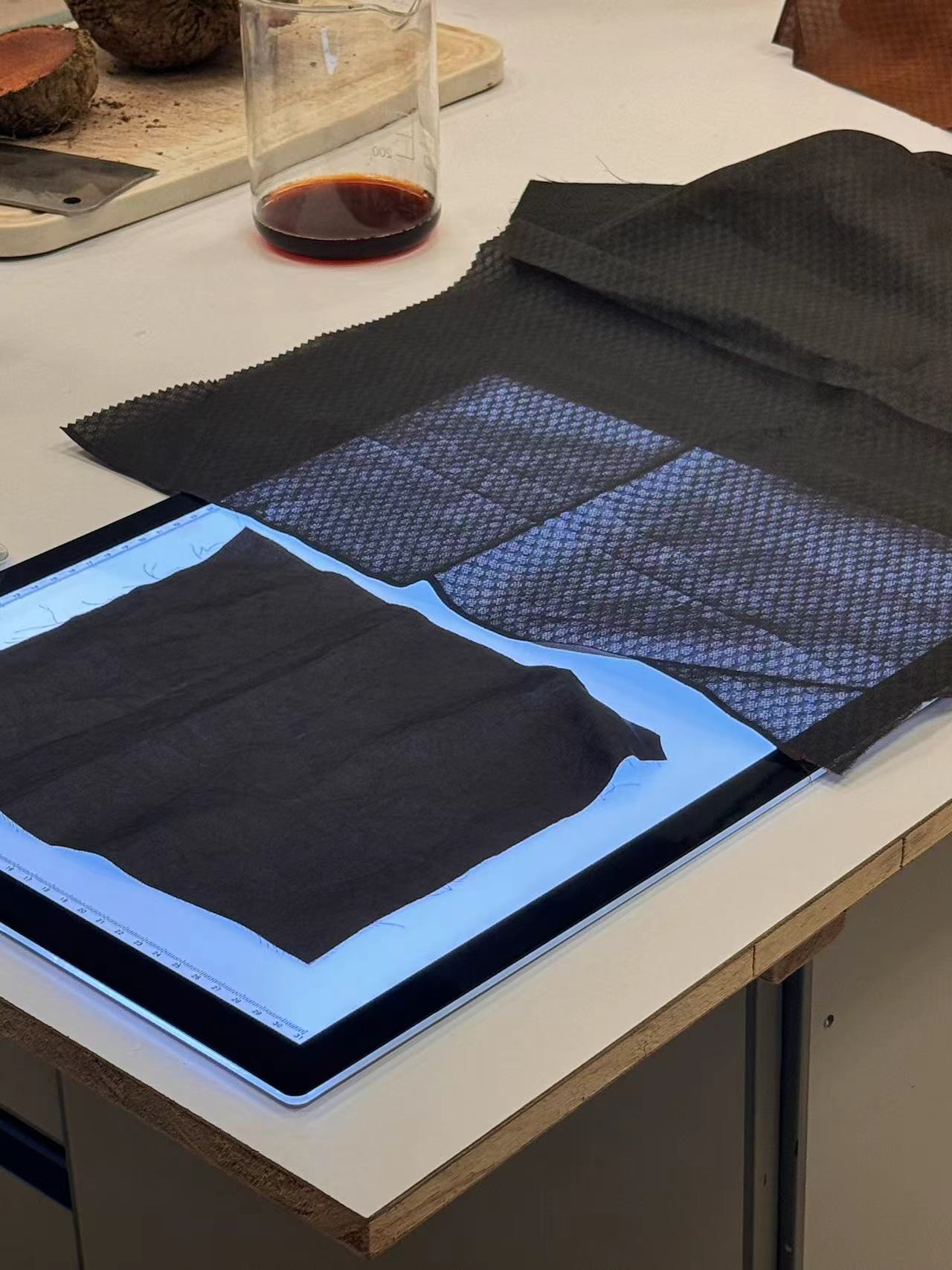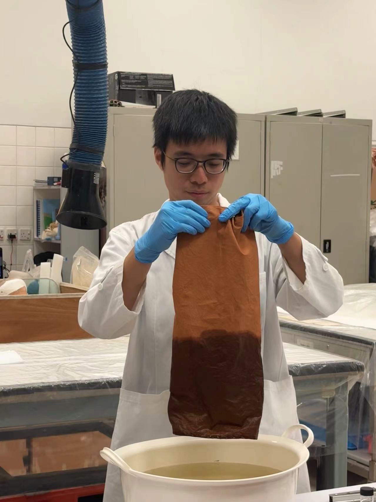 文物修復辦事處二級實驗室技術員(文物修復)張璟謙展示「過烏」後的香雲紗 圖:橙新聞