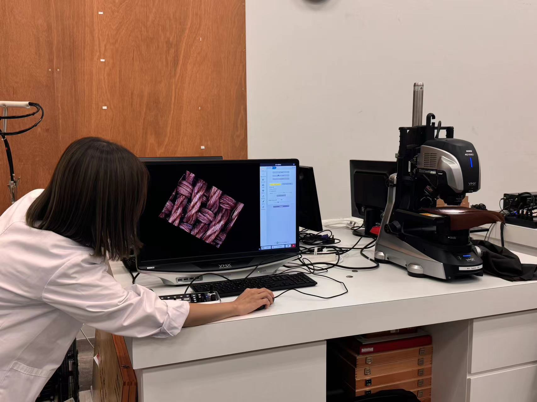 研究文物中的化學元素少不了精密儀器,能量散射X射線譜儀與傅里葉變換紅外線光譜儀都是進行化學分析的好幫手。甘婉君現場演示以機器觀測織物細節的狀態,她表示,三維顯微鏡的優點是能以立體方式呈現物品的狀態,而如果本身樣本較大,則需要做成小小一顆、抽成真空,放於顯微鏡下觀察。
