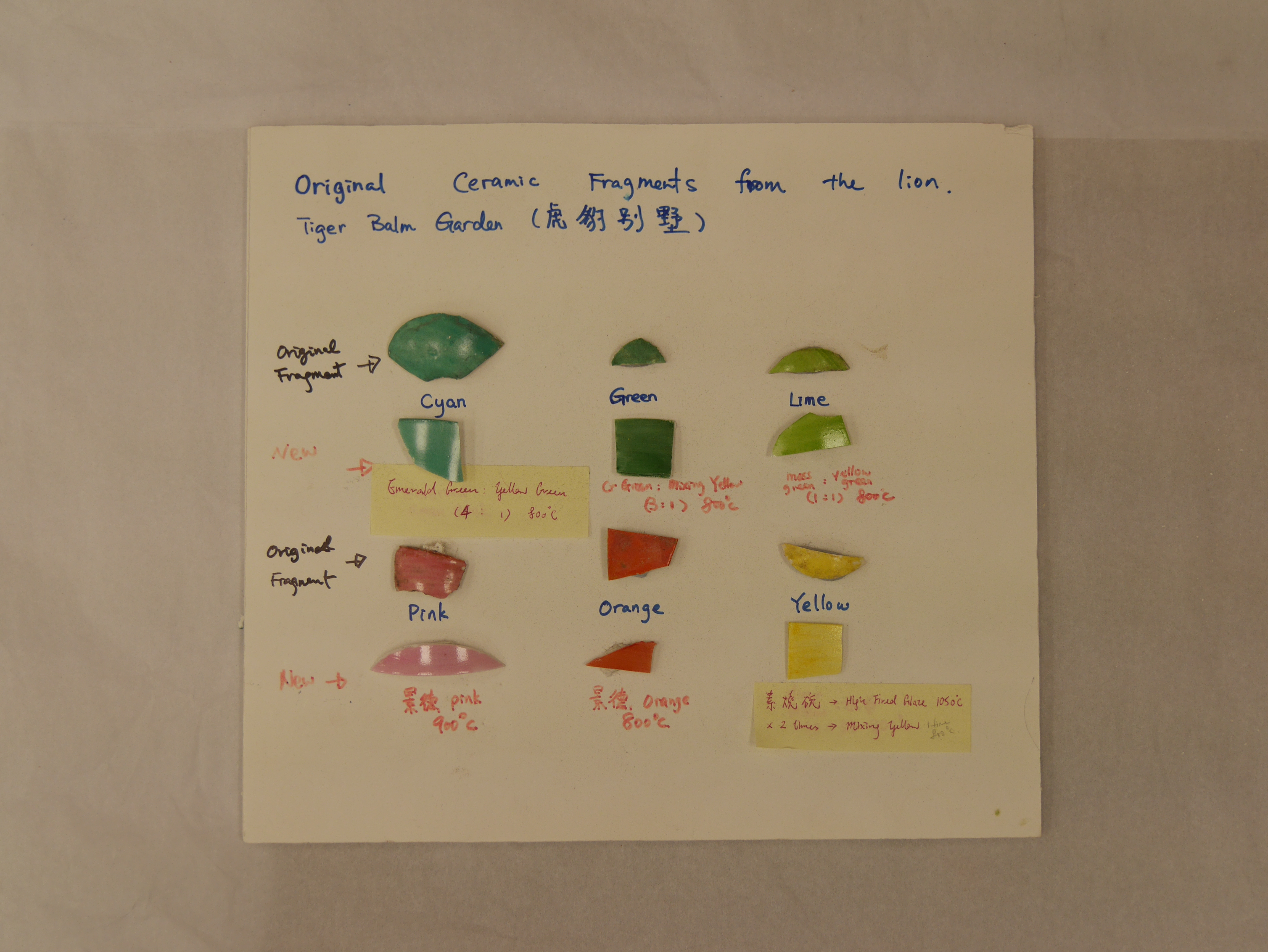 修復的具體過程中,需要經歷將釉料塗抹到碗上、放入窯中燒製固定顏色、切割成所需形狀、使用天然水硬石灰固定位置等一系列步驟,甘婉君透露,難點在於顏色在燒製後往往會發生微妙的變化,而這件事難以一早預計,只能反復嘗試,而此次的修復,則花了數月時間在調配顏色上,全程都是大家一手一腳做出來的,當中也能看到不少民間智慧,比如選取適合的玻璃做獅子的眼睛等。