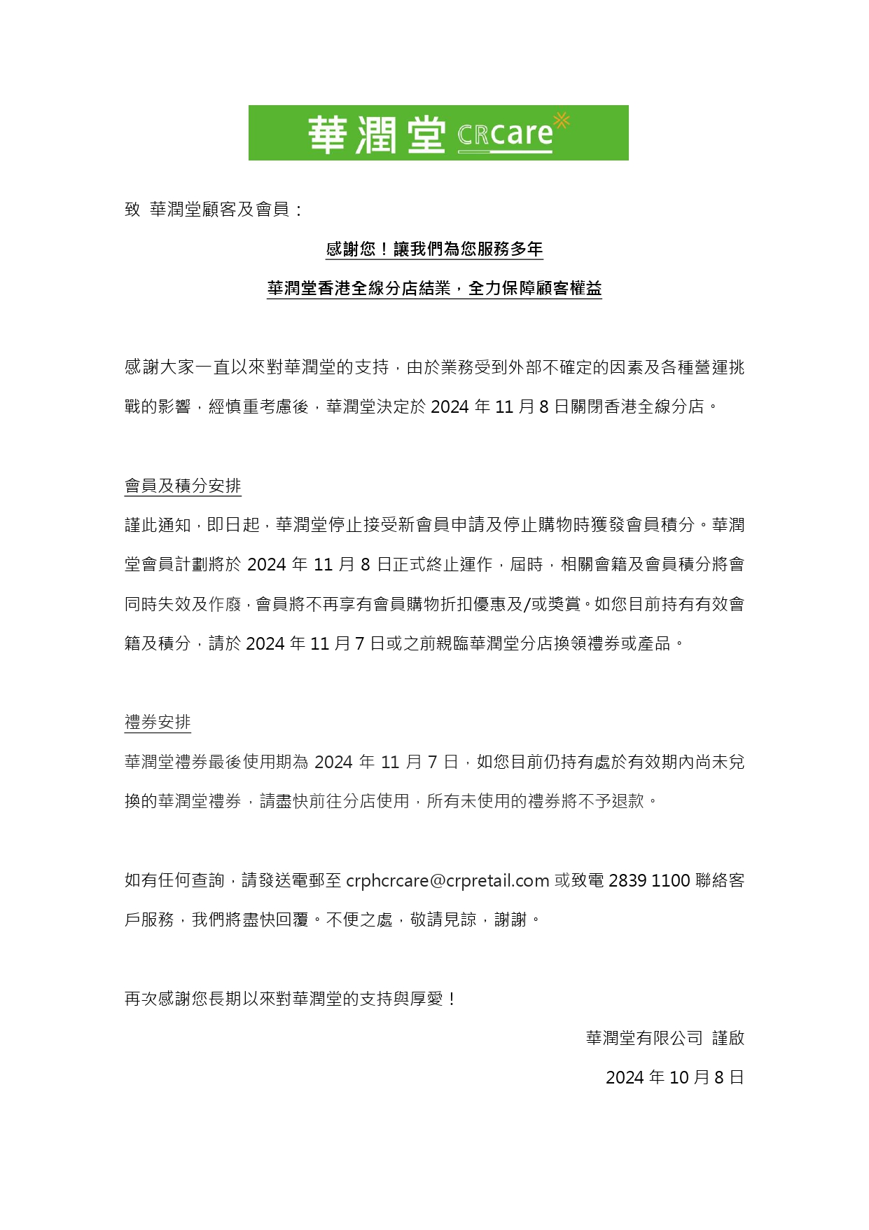 華潤堂在社交媒體上發出聲明指,感謝大家一直以來的支持,由於業務受到外部不確定的因素及各種營運挑戰的影響,經慎重考慮後,決定於11月8日關閉香港全線分店。