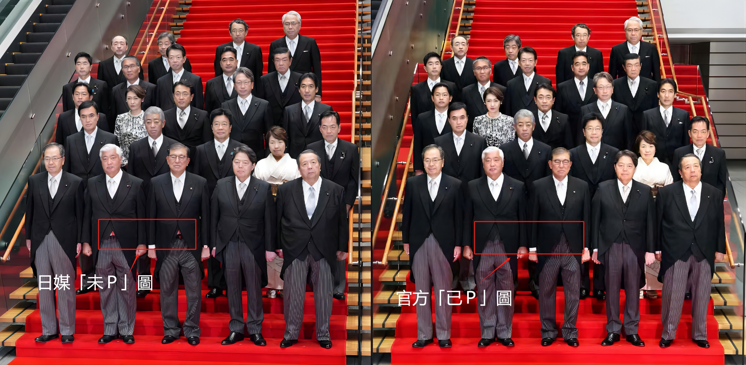 日本新內閣合影「P圖」前後對比。
