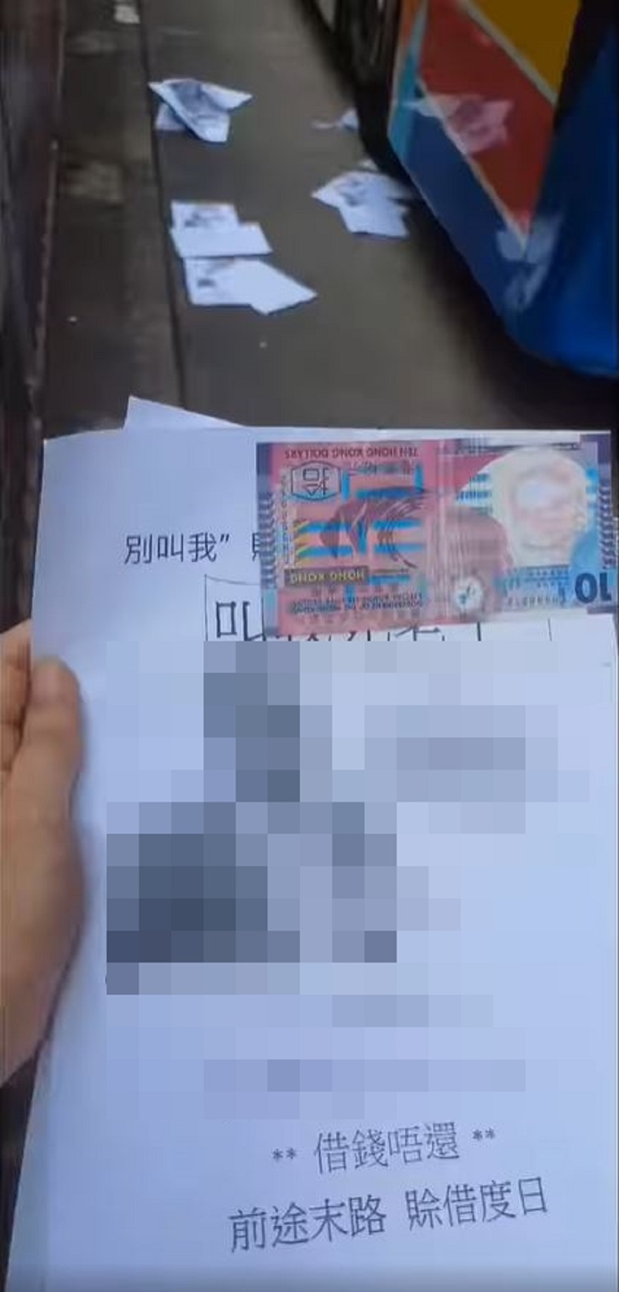 上環德輔道中街頭散落數十張追債單張,每張單張夾着10元紙幣。