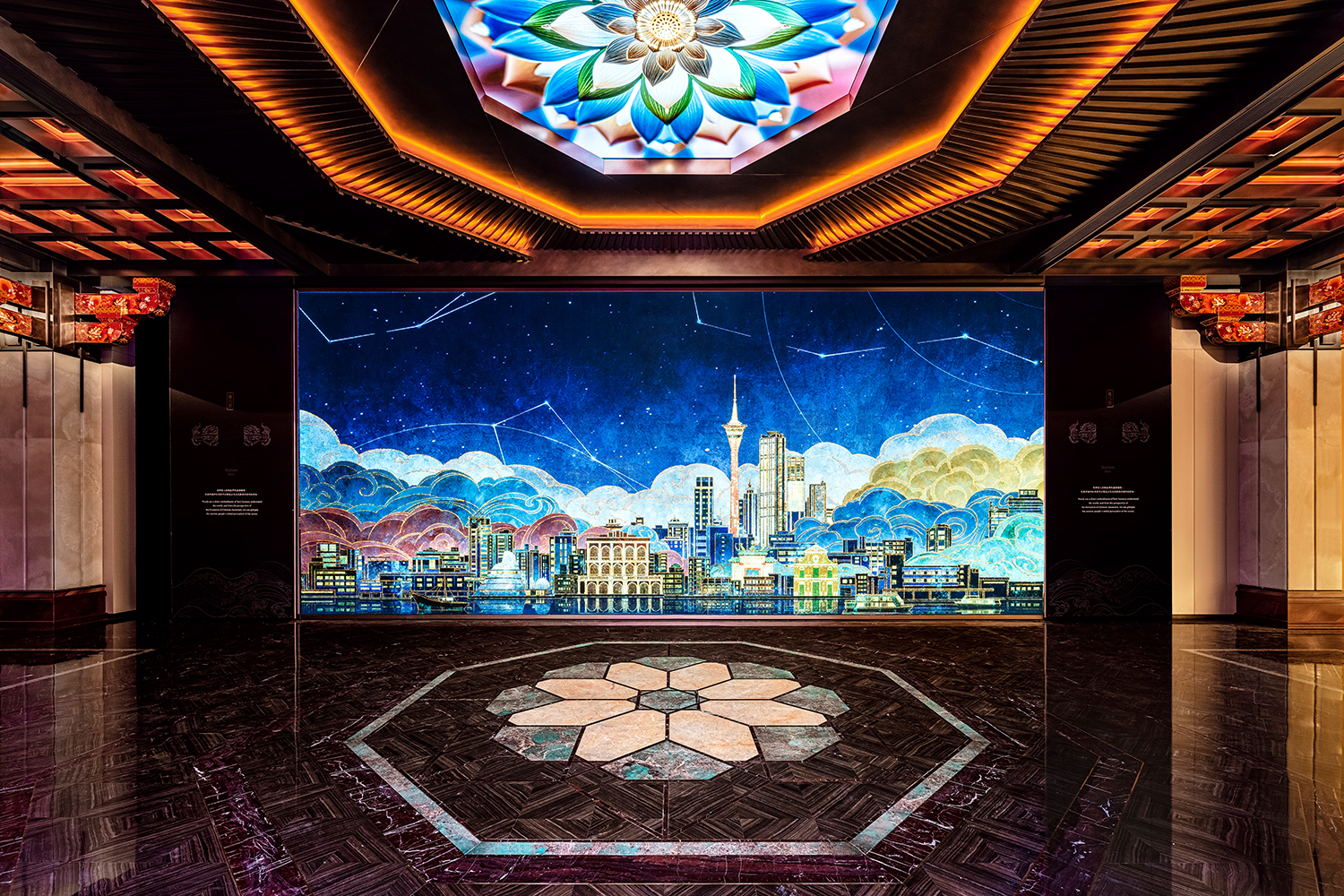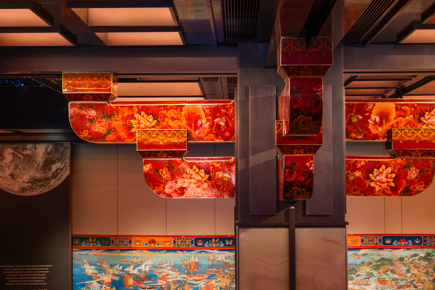 保利美高梅博物館坐落於澳門美高梅二層,空間面積近2,000平方米,按照國家一級文物展陳標準建造,為展品提供精準的環境控制,滿足各國文物展出要求。博物館的設計透過現代建築語言賦能中國傳統非遺工藝,展廳廊柱匠心呈現景泰藍掐絲琺瑯工藝與中式鬥拱智慧,並結合圍繞「一帶一路」沿線主要國家的文物與藝術元素,重建文物及空間敘事,彰顯歷史價值,襯托文化底蘊。