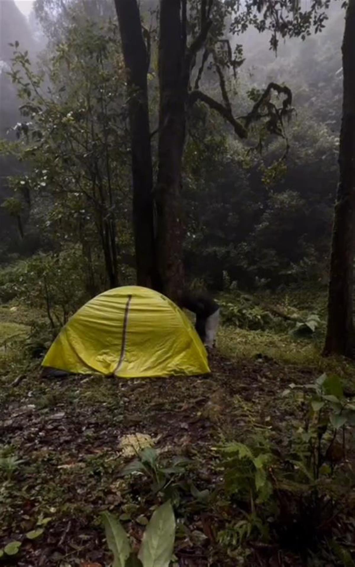 該網紅在哀牢山露營搭建帳篷。