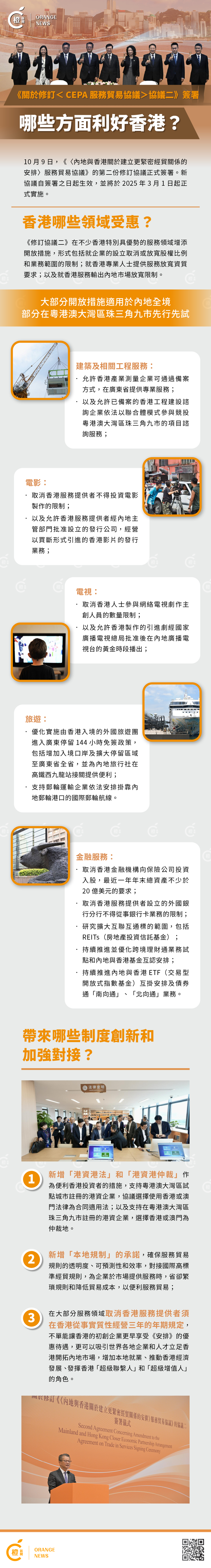 【橙訊】10月9日,《〈內地與香港關於建立更緊密經貿關係的安排〉服務貿易協議》的第二份修訂協議正式簽署。新協議自簽署之日起生效,並將於2025年3月1日起正式實施。
